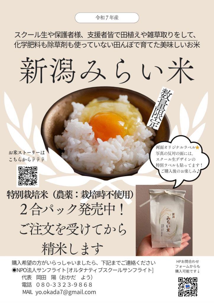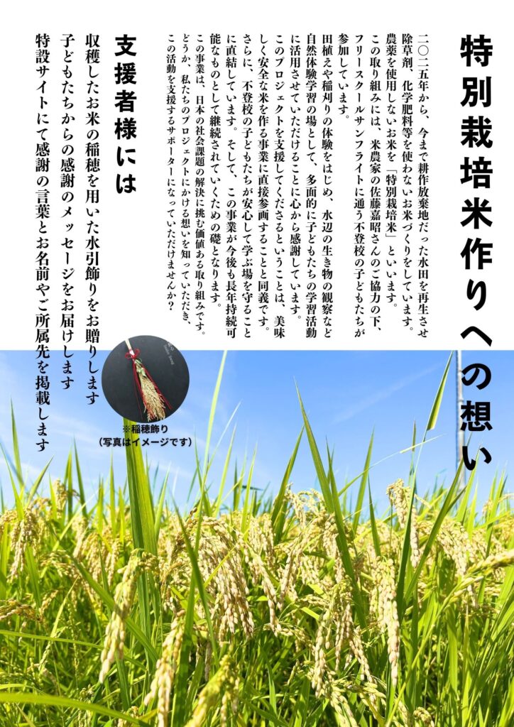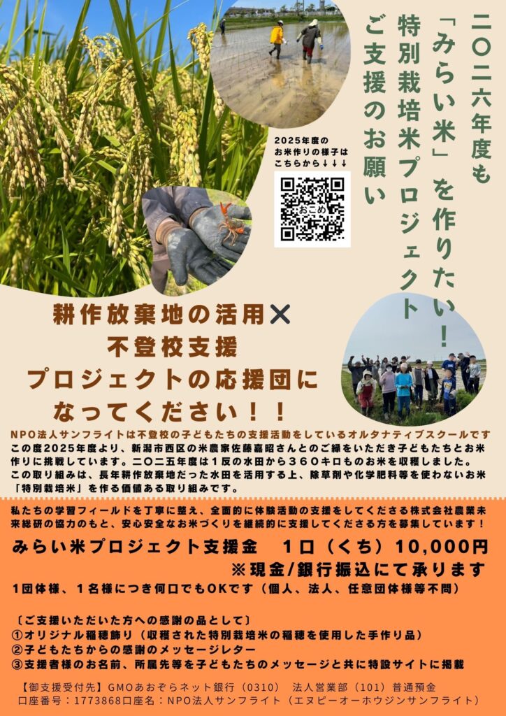 サンフライトでは2026年のみらい米づくりをサポートしてくださる方を募集しております。